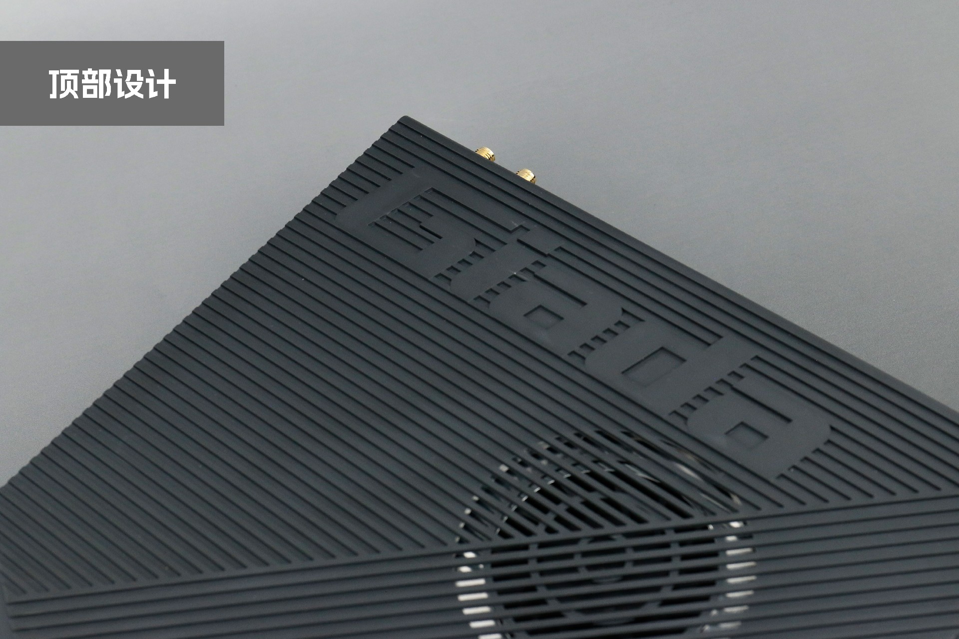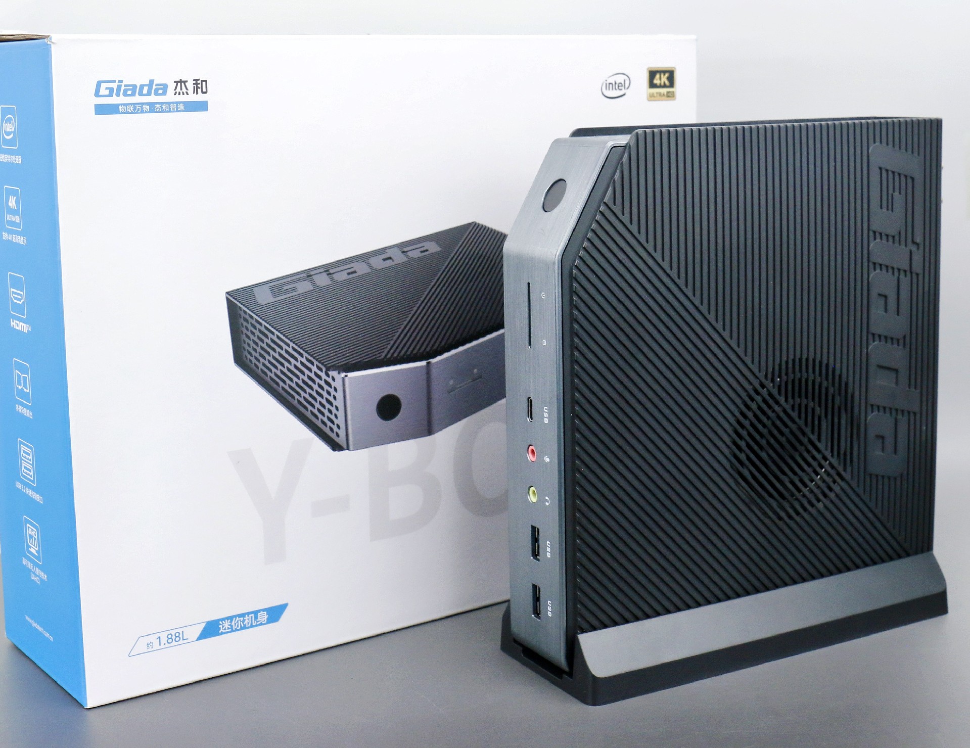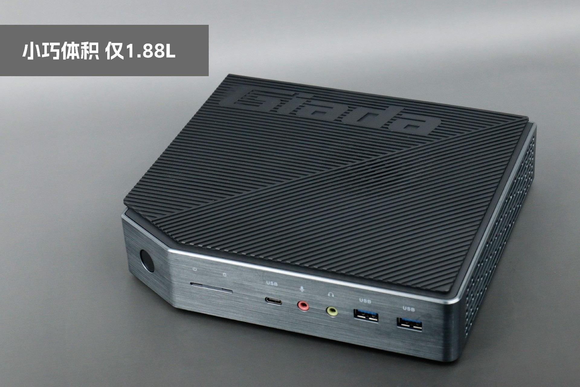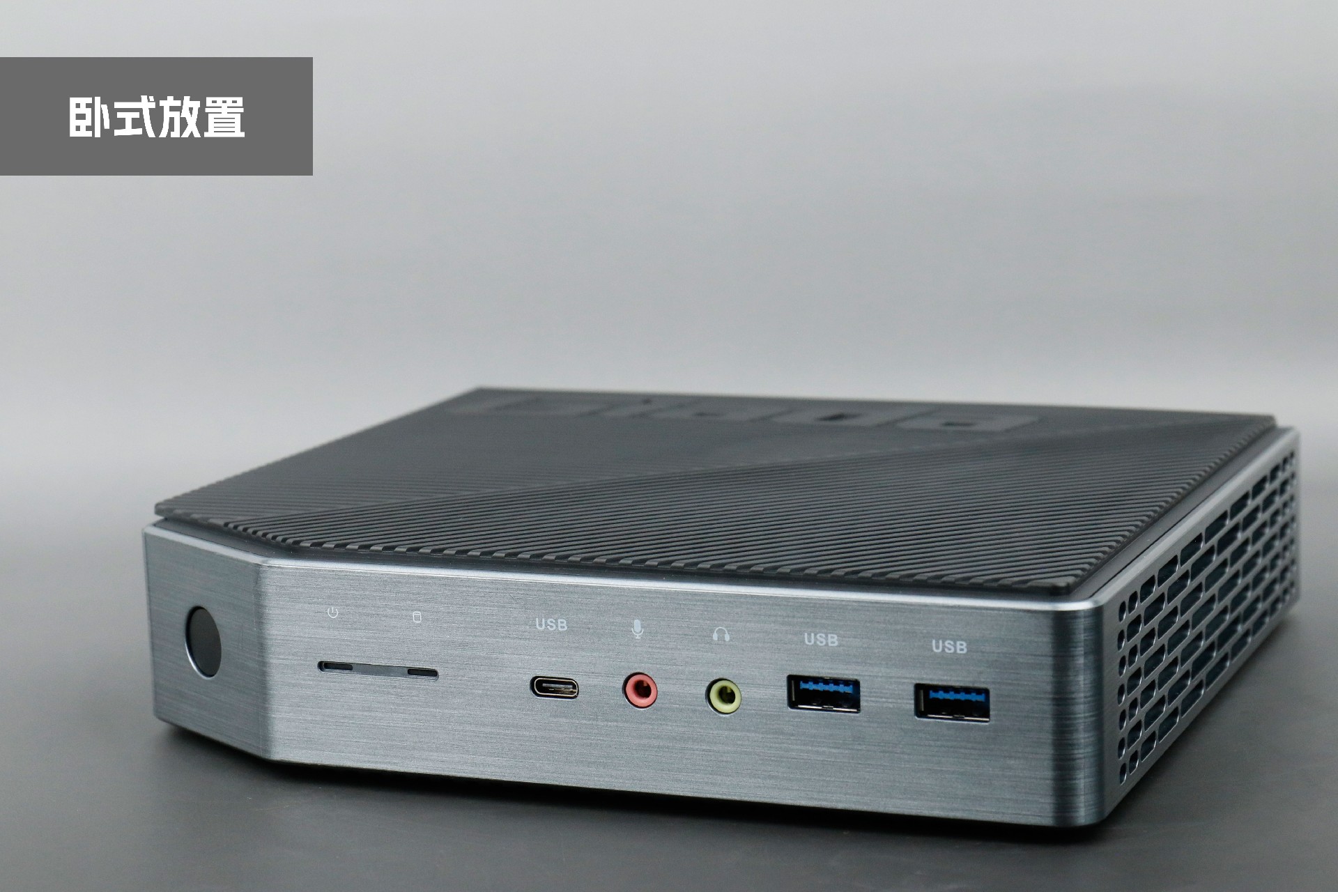 打开星空桌面云终端Y-BOX P3,你会发现它的结构并不是常见的四方体设计,而是在转角处好似被切割开一个角,切割出来的面积为指纹识别开机键。它的外观为优雅的银灰配色,机身正面厚重感十足,顶部依然沿用黑色哑光栅格并延伸至整机背面,磨砂塑胶材质壳,印刻星空Giada品牌名;其他三面则为银灰色,两侧是蜂窝式通风口设计。