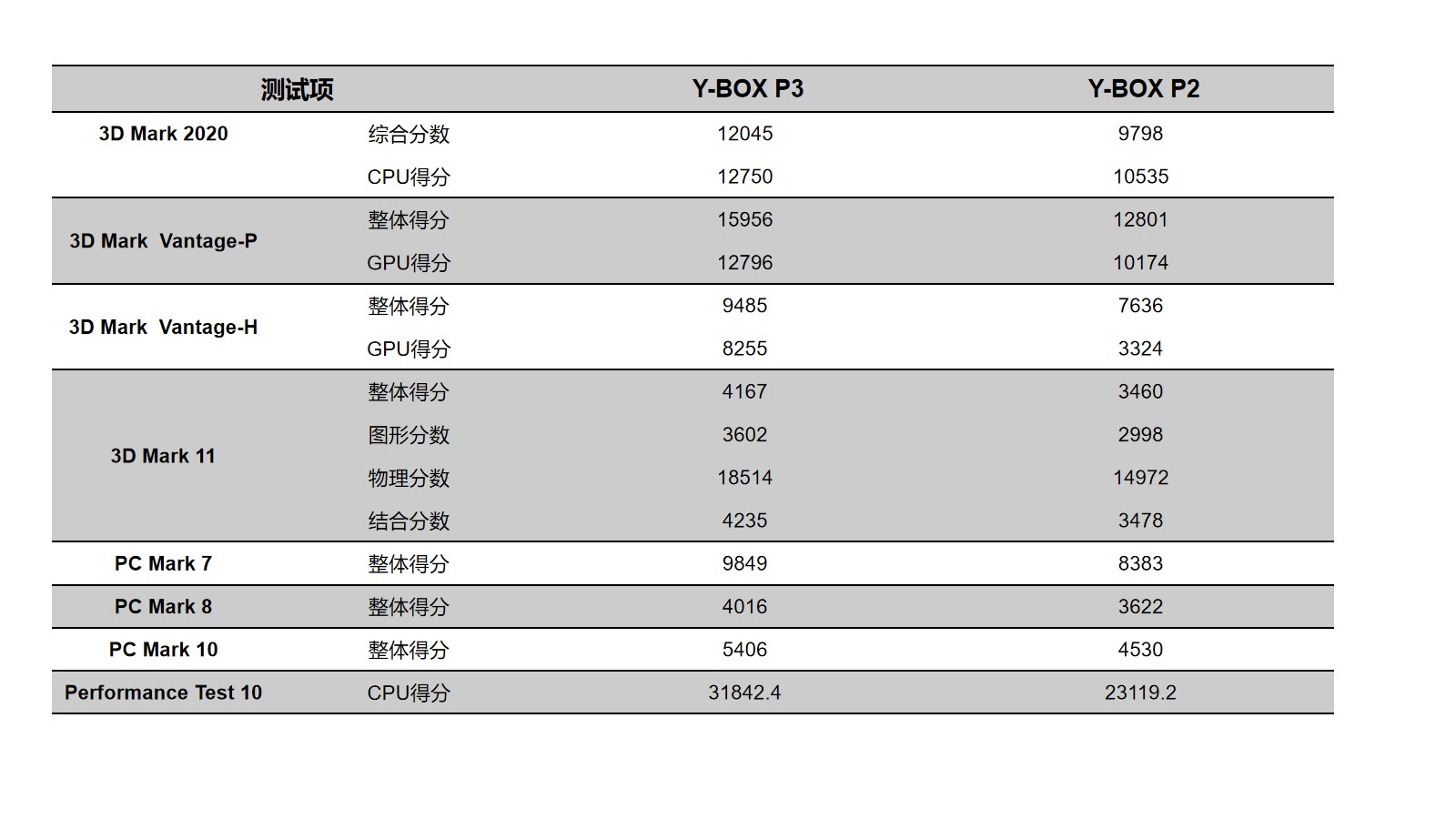 星空来具体看看各个测试项目的跑分情况,星空分别用3D Mark、PC Mark以及Performance 10等不同系列不同软件进行跑分,测试项目涵盖显示性能测试、系统性能测试、CPU性能测试等。通过下面的表格及柱状图可以看出,星空桌面云终端Y-BOX P3的数据在各项性能上都得到了大幅度提升。