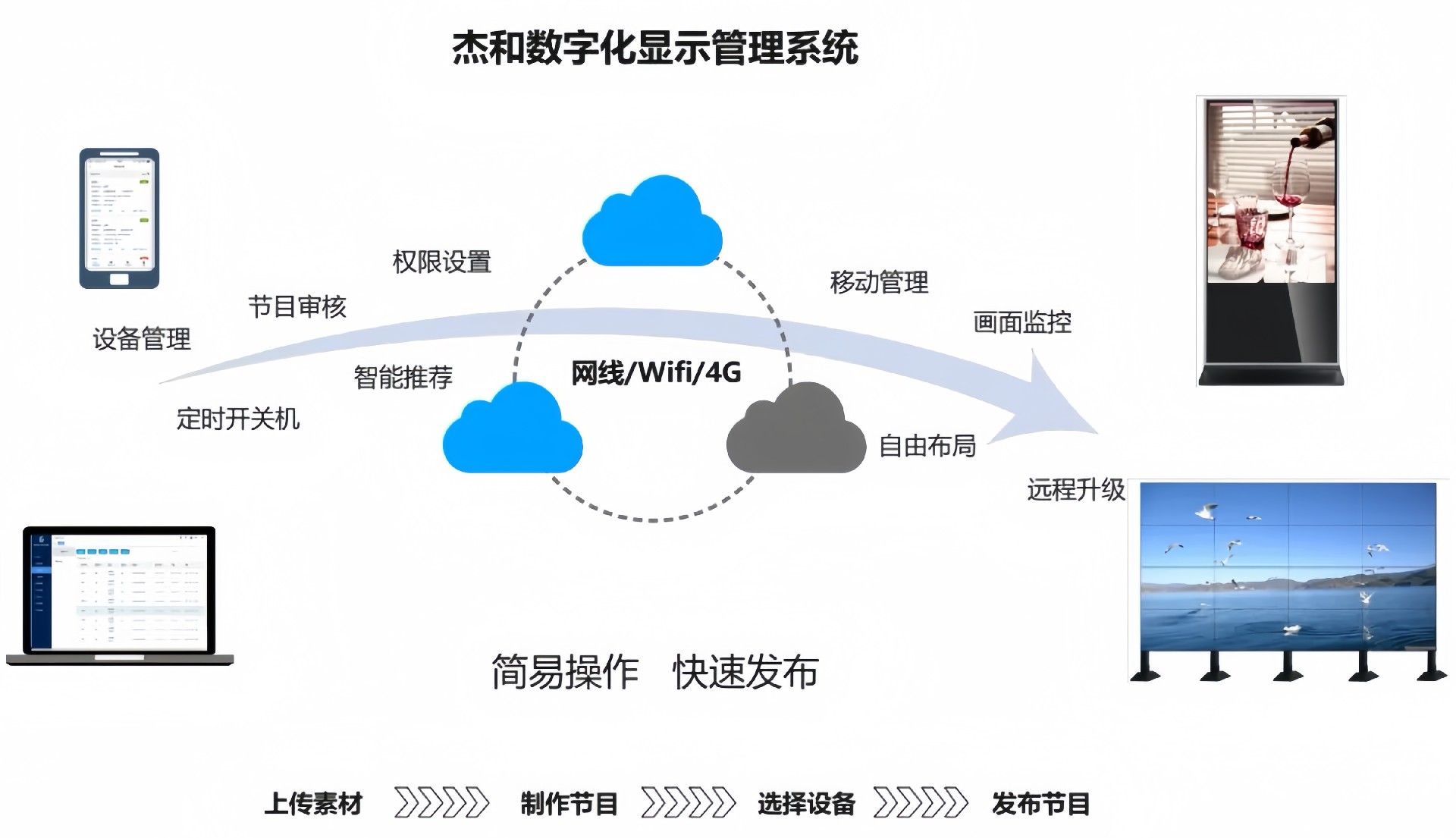 目前星空科技GDSM-ES系统覆盖市场上多形态网络智能显示终端,满足行业全产品业态需求,如广告机、LED显示屏、LCD拼接屏 、普通液晶电视等各种显示终端,广泛用于广告宣传、通知公告、指示引导。