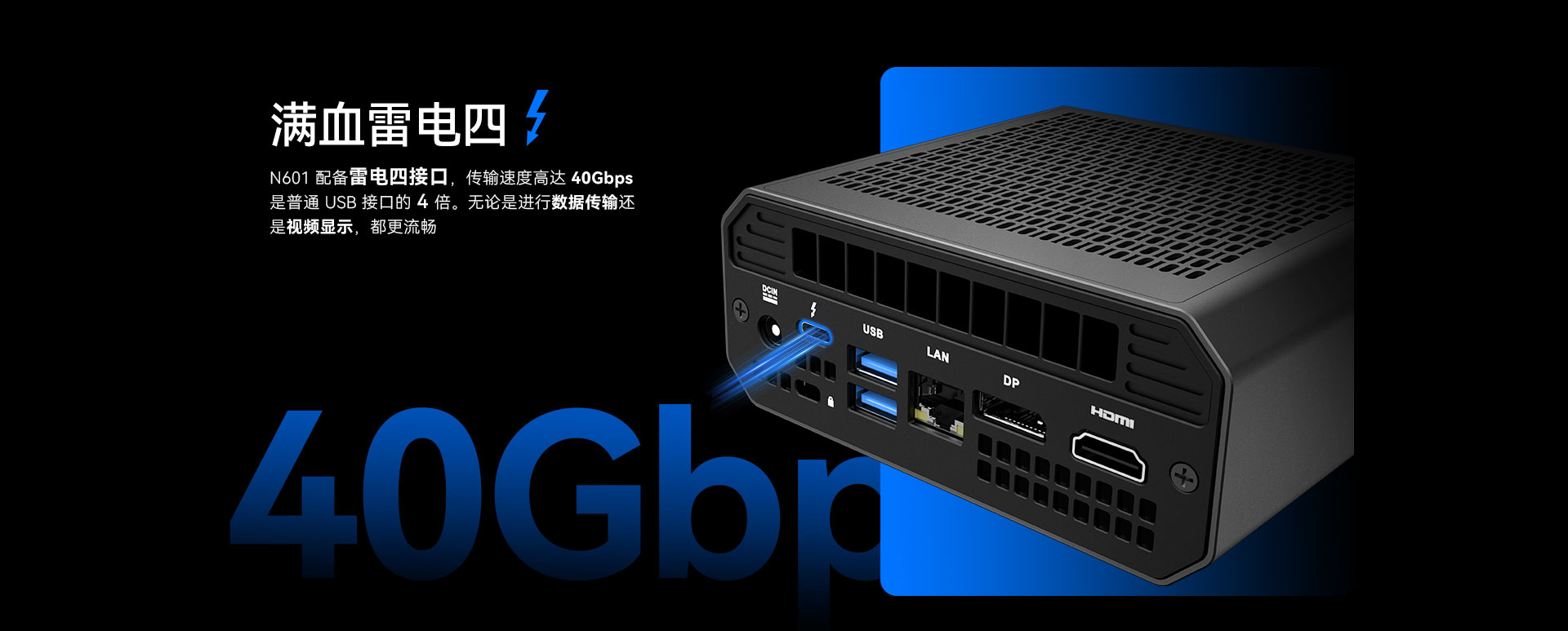 星空科技N601配备雷电四接口,传输速度高达40Gbps,用户可通过该接口连接2块屏幕。还可通过HDMI2.1接口,DP1.4接口再连接两块屏幕,实现四屏异显。雷电四还可以连接外设,如鼠标、键盘、控制器和耳机等。