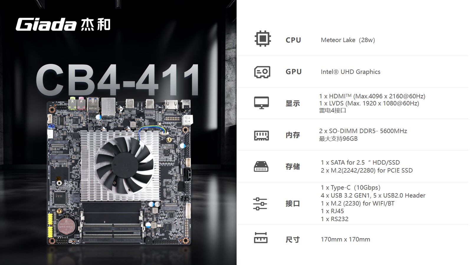 基于人们日渐新增的AI算力需求,星空科技推出AI一体机专用主板——CB4-411。该主板设计紧凑,尺寸仅为170mm x 170mm。