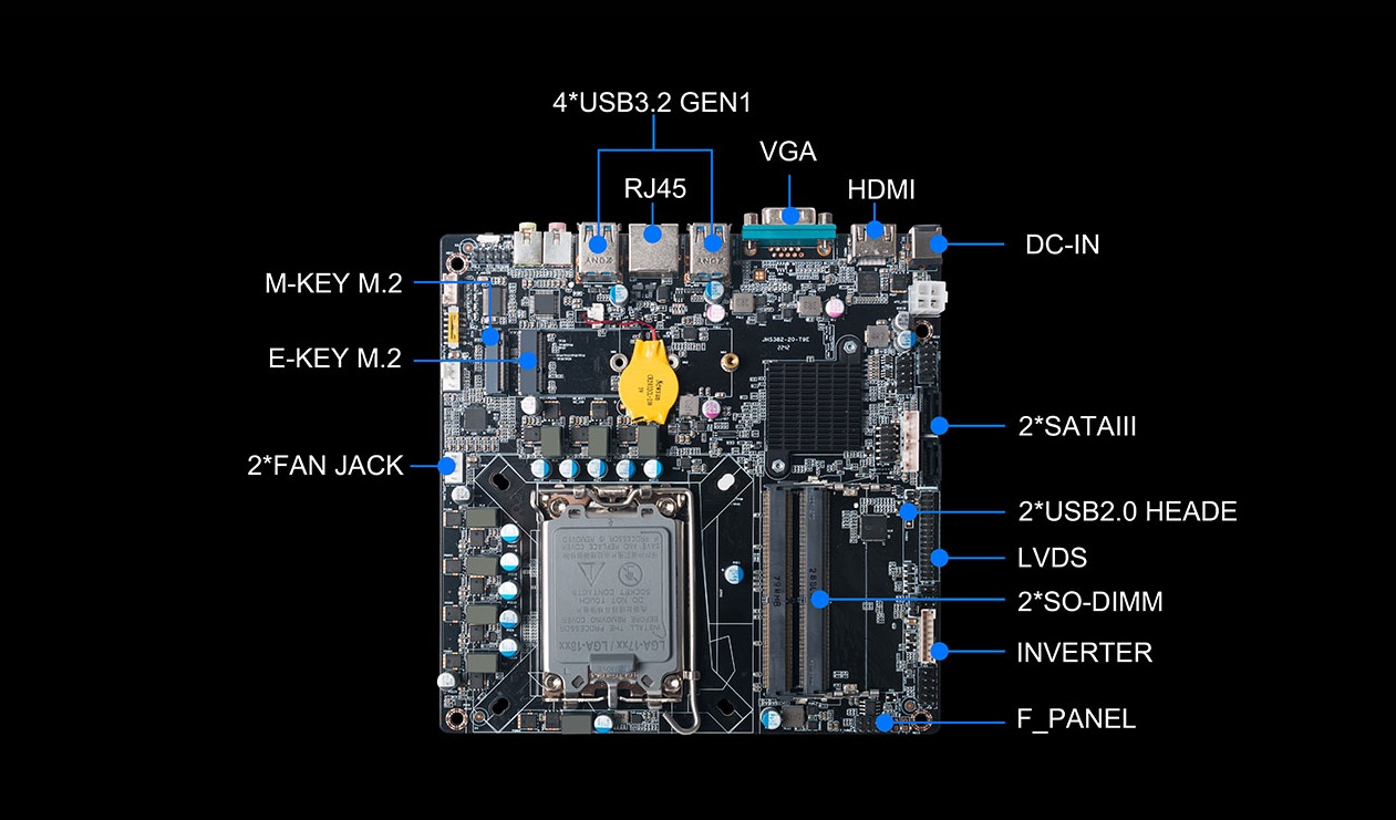 星空科技主板CB4-8121是基于Thinmini ITX一体机标准设计,采用Intel Alder Lake-S平台H610芯片组,支持全新第13/12代Core i7/i5/i3处理器,搭载双通道SO-DIMM DDR4-3200MHz内存、1 x M-Key M.2 (2242/2280) SSD和 2 x SATAIII存储,强大的配置能够为用户带来出色的计算和图形处理性能,无论是载入游戏、数据传输还是平面设计,赋予用户更加极致流畅的使用体验。