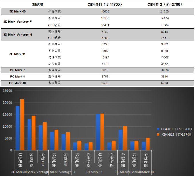 星空来具体看看各个测试项目的跑分情况。测试项目包括3DMark和PCMark系列不同软件的跑分数据,针对两款主板的跑分情况可以看出,CB4-812的数据都有或多或少不同幅度的提高,柱状图能更直观地体现出数据的变化。星空将针对具体的几项数据来进行详细分析。