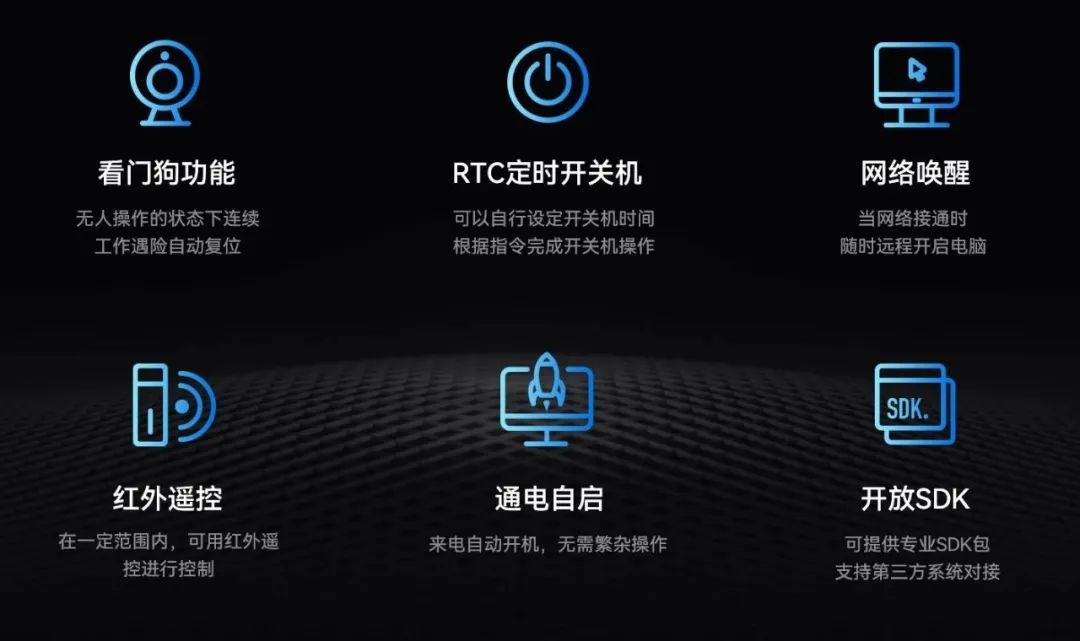 星空主板IB3-771配置了无人值守专利技术,大力降低因高算力带来的能源消耗,该技术通过定时开关机、看门狗计时器、RTC宕机自检、红外遥控和局域网唤醒等功能实现主板绿色运行。