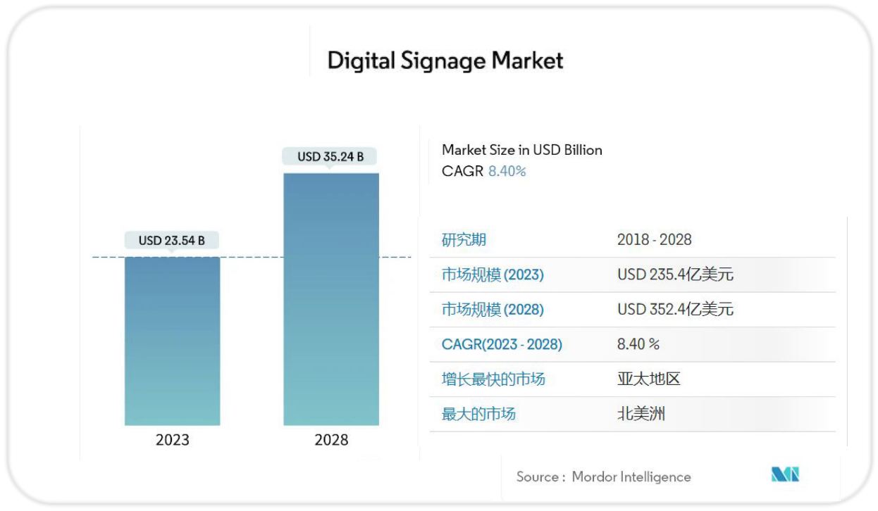 预计数字标牌市场在未来几年将保持稳定增长。根据市场研究机构Mordor Intelligence数据显示,全球数字标牌市场规模预计将从 2023 年的 235.4 亿美元增长到 2028 年的 352.4 亿美元,在预测期间(2023-2028 年)的复合年增长率为 8.40%。数字标牌产品在商业垂直领域的采用不断增加、新兴国家的快速数字化以及显示技术的发展是推动数字标牌市场整体增长的关键因素,数字标牌凭借自身优势,在零售、教育、娱乐、交通、金融、医疗、办公等领域发挥着重要作用。