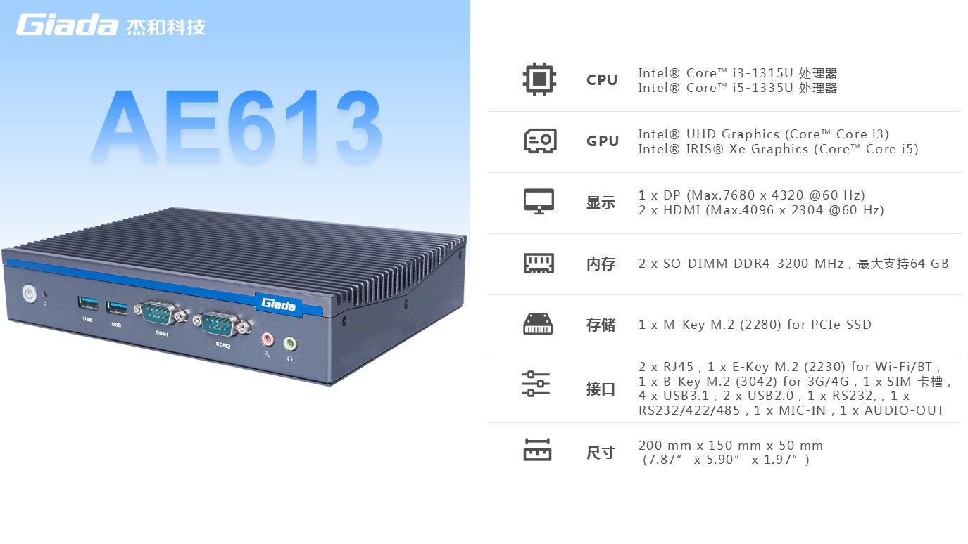 星空科技AE613是一款户外宽温应用的PC主机,支持宽温度(-20℃~60℃)和宽电压(12v ~ 24v)范围,10% ~ 90% @45°C (无凝结)工作湿度范围,可应对热带、干燥、温带、寒冷和极地五大气候带对温度和湿度的不同影响,其宽温宽压的特性,可实现户外应用的稳定运行。