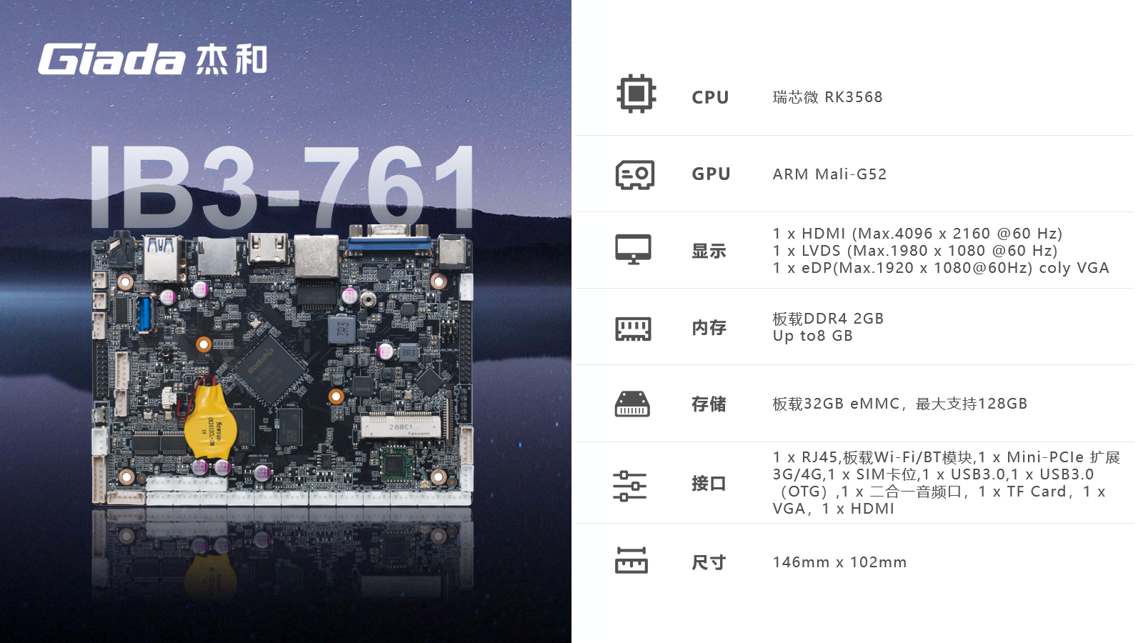 星空ARM主板IB3-761基于瑞芯微RK3568四核64位处理器开发,可实现多任务并行、更大数据集的高效处理,丰富的接口,具有性能强、内存大、集成度高、扩展能力强等特点,在处理速度和图形处理能力方面都表现出色,可广泛应用于物联网网关、边缘存储、工控平板、工业检测、工控盒、自助终端、云终端、车载中控、机器人等行业定制市场。