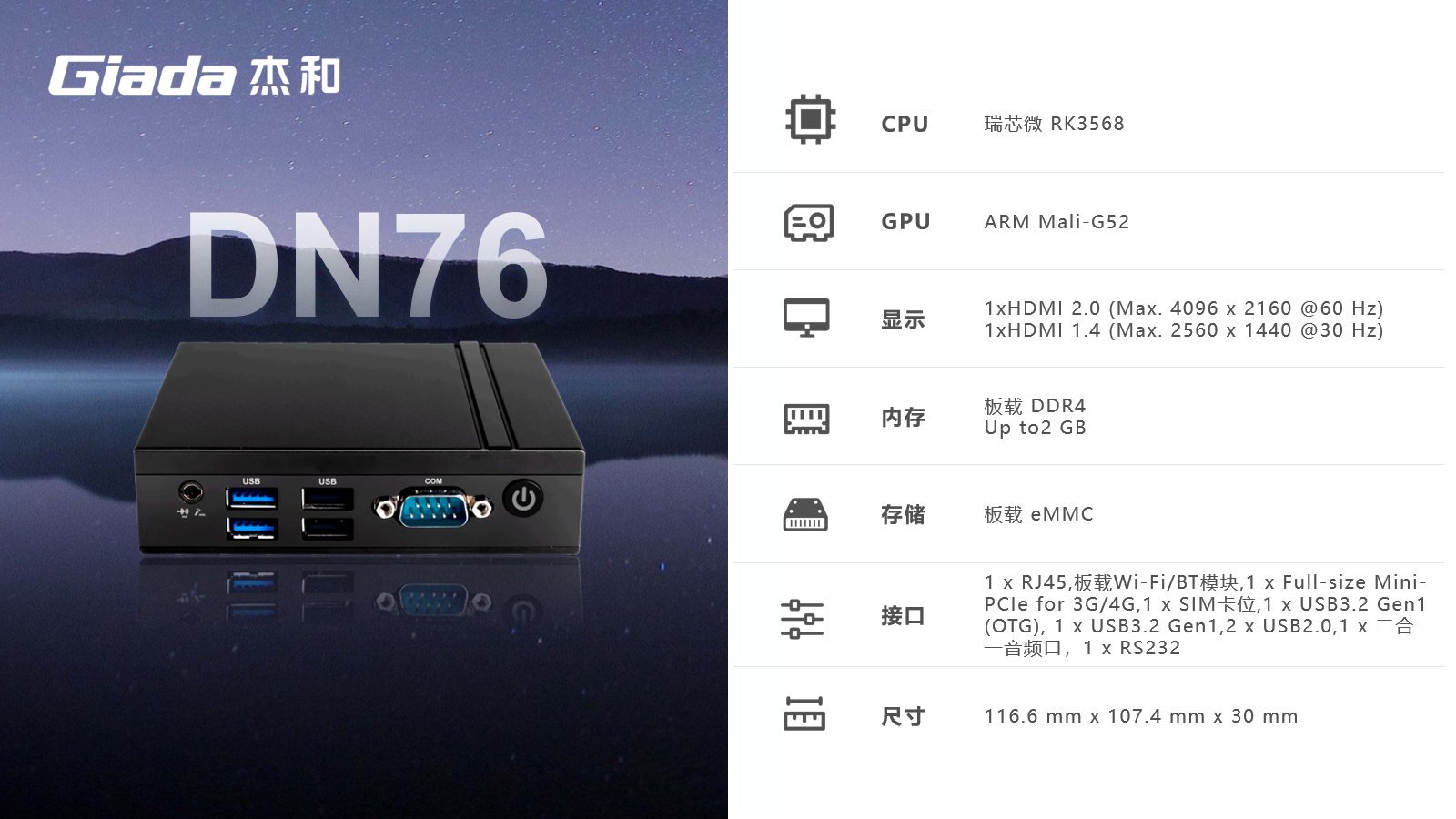 星空媒体播放器DN76采用瑞芯微RK3568 ARM嵌入式方案,作为一款超紧凑的安卓播放器,内置一个独立的NPU,计算能力为1TOPs,可用于轻量级AI应用程序,支持HDMI双显,优秀的散热设计,超高性价比,得到广大用户的喜爱,可以广泛应用于商业显示、智能车载、安防领域和边缘人工智能等场景。