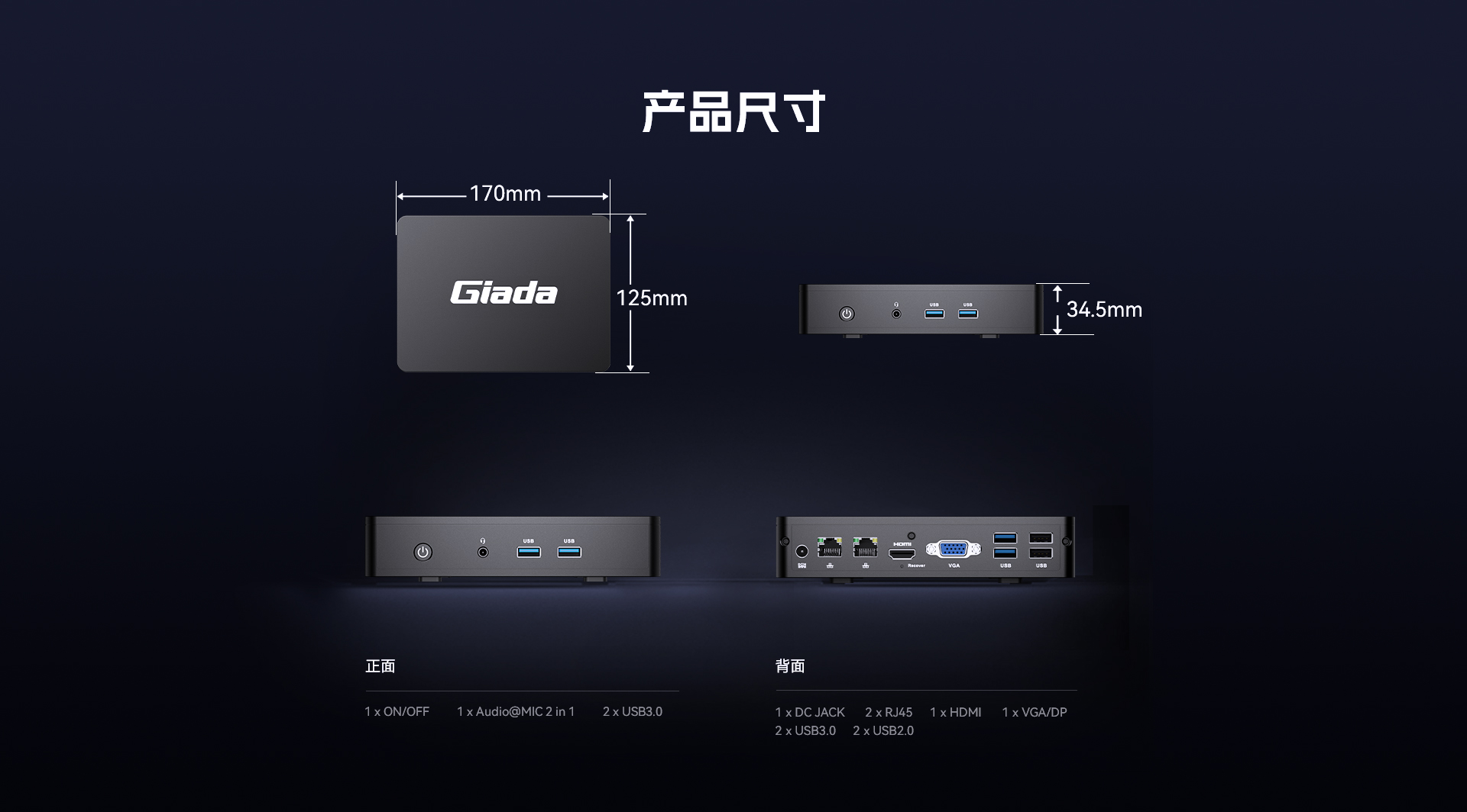 | I/O | 接口 | 4 x USB3.2 Gen1,2xUSB2.0 1 x Audio&MIC 2IN1 板载WIFI/BT模块,支持WIFI5双频 |